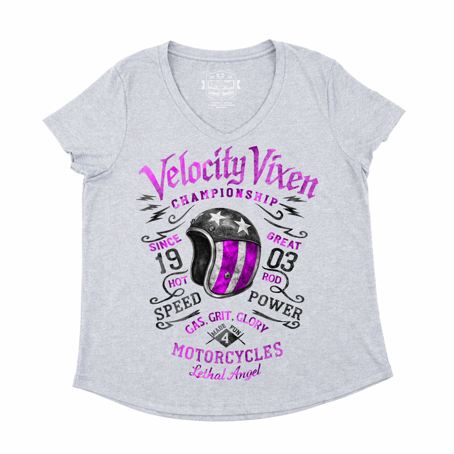 The Velocity Vixen design blends vintage racing grit with bold feminine energy, featuring a classic helmet graphic accented with striking pink details. Arched typography and distressed textures give it an old-school championship feel, layered with lightning bolts and heritage-inspired lettering. The mix of charcoal gray and vibrant magenta creates strong contrast that commands attention without overpowering the layout. Every element works together to deliver a fearless, high-speed aesthetic built for gas, grit, and glory.