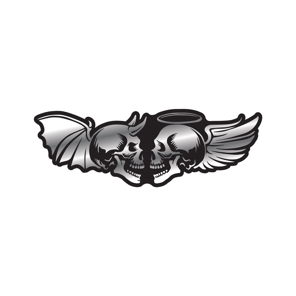 You can celebrate your good and evil sides with our Angel and Devil Skulls ABS Emblem. Whether you're looking for a more factory/original equipment look for your vehicle or just want to give the perfect gift to the good/bad folks you know, this chrome skull emblem sticker is a true original.